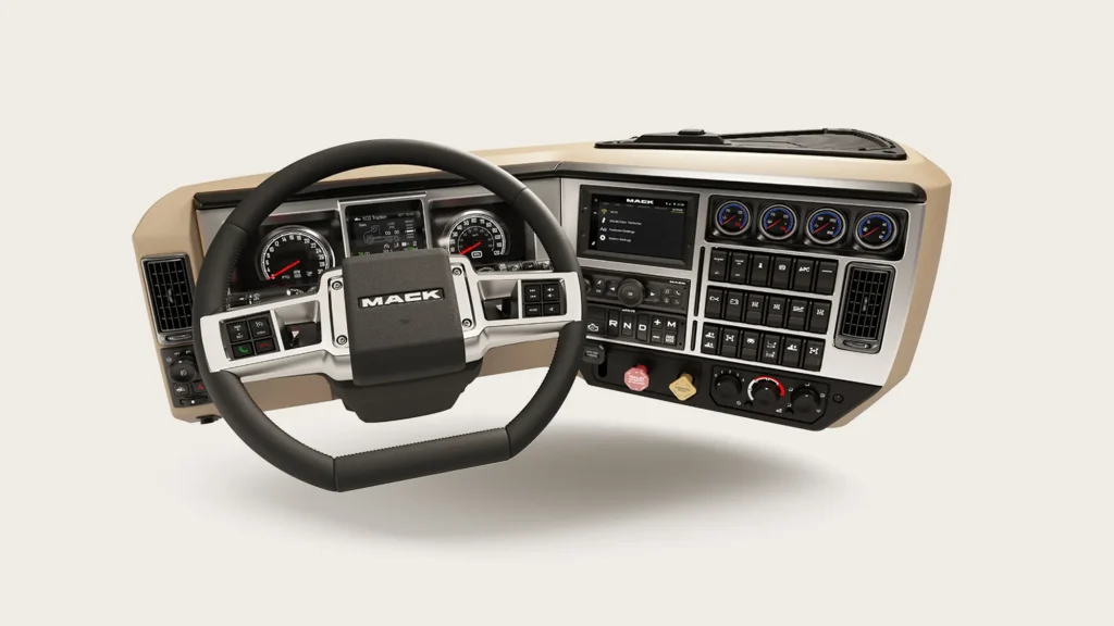 La cabine du Granite est pensée pour les opérateurs de terrain : isolation acoustique renforcée, commandes intuitives, écran multifonction centralisé et options de connectivité modernes. Le siège à suspension pneumatique, les rangements intelligents et la visibilité étendue permettent de rester productif, même après de longues heures. Grâce au système Mack Connect, vous surveillez en temps réel les données de consommation, l’état du véhicule et les échéances d’entretien, assurant la rentabilité et la fiabilité de votre flotte. Le Mack Granite allie puissance brute, intelligence embarquée et confort de conduite pour un rendement inégalé sur tous vos chantiers.